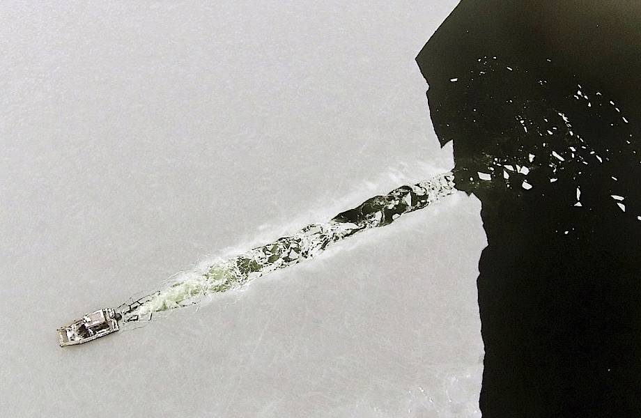 Лодка прорезает свежий слой льда в бухте Марион