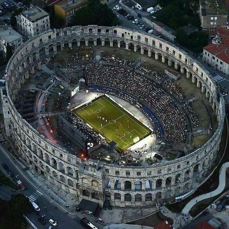 Футбольный матч, прошедший на территории римской арены, которой около 2 тысяч лет, Пула, Хорватия