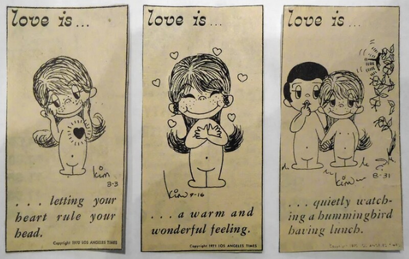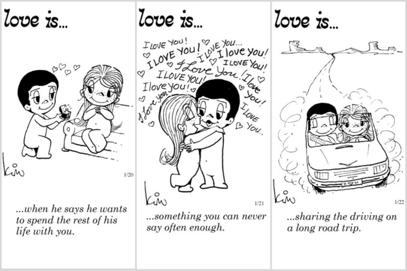 Так что в милых картинках Love is… действительно спрятана любовная история, ведь эти комиксы превратились в настоящую эпопею о любви длиной как минимум в пять десятилетий. На старых рисунках, созданных еще Ким, иногда можно увидеть ее имя или букву R, например, написанную на песке: это прямая отсылка к ее любимому мужчине.