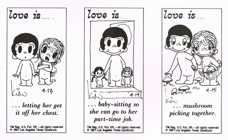 Комикс с милой парочкой придумала Ким Гроув (Kim Grove) из Новой Зеландии в конце 1960-х годов: она рисовала влюбленных своему будущему мужу, Роберто Казали (Roberto Casali). Ее герои почти всегда были без одежды, иногда на девушке мог быть фартук или какая-то специфическая форма. Каждый рисунок сопровождался надписью «Любовь это…». Рисунки никогда не были связаны друг с другом, каждый из них — отдельная история.