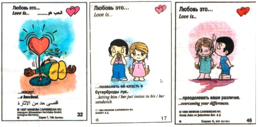 Жевательная резинка Love is… родом из Турции, а в Россию и страны СНГ попала в 1990-х годах. Однако герои этих вкладышей гораздо старше: они «родились» примерно за четверть века до того, как Love is… попала на российский рынок. Когда-то герои ее вкладышей были без одежды, но в них было столько же любви и добра.