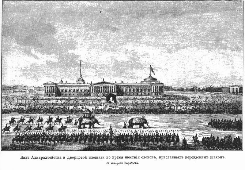 Пожалуй, самый роскошный подарок был от персидского шаха Надир-шаха: в 1741 году от него к императорскому двору прибыли 14 слонов. Презент предназначался Елизавете Петровне и был преподнесен не просто так, а в качестве предложения руки и сердца. К приходу заморских гостей хорошо подготовились, в Петербурге даже отстроили слоновник, где животные прожили несколько лет.