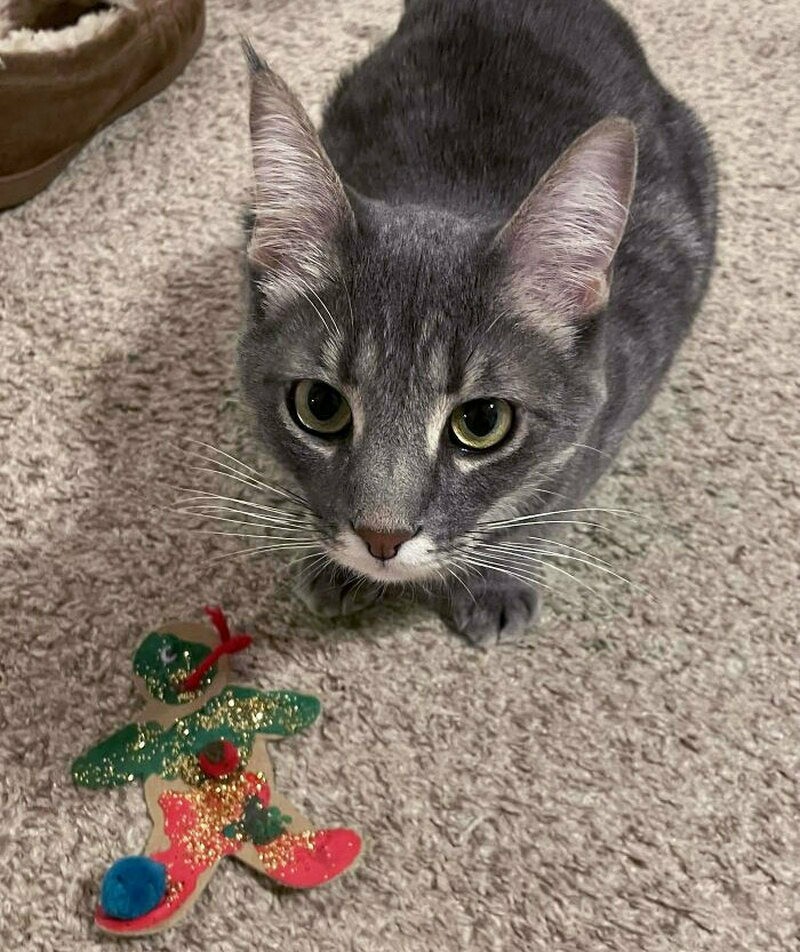 Кот Артур принес елочную игрушку к двери спальни, так как его владелец весь день пролежал в постели из-за болезни