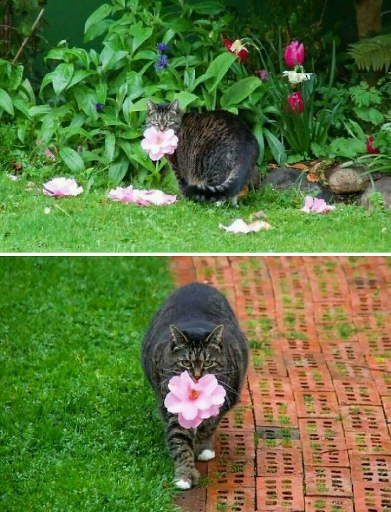 Кошечка ждет, когда упадут цветы, а затем приносит лучшие из них своему хозяину