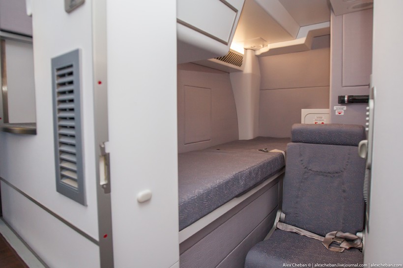На нижней палубе Эйрбас А380 у окна сидеть менее комфортно, потому что из-за кривизны фюзеляжа между крайним креслом у окна и стенкой очень большое расстояние, положить голову набок, упершись в стенку, не получится, туда постоянно проваливается подушка. Поэтому, при возможности, выбирайте места на верхней палубе, спать там комфортнее, фюзеляж закругляется как раз на уровне вашей головы.