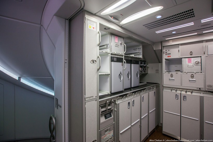 Также на верхней палубе есть дополнительный отсек для личных вещей на уровне подлокотника кресла. Опять же, все это благодаря кривизне фюзеляжа двухпалубного борта А380