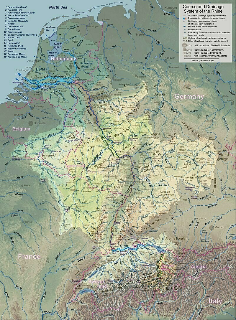 Главные европейские реки Дунай и Рейн текут в разных направлениях. Исток Рейна — в Альпах, он впадает в Северное море, проходя через Боденское озеро.