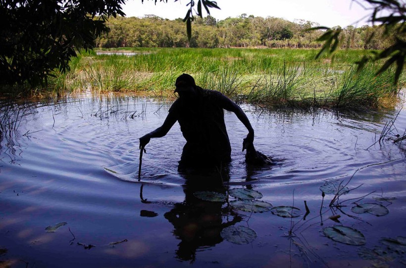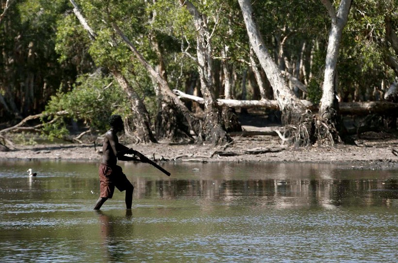 Юные аборигены с детства помогают родителям на охоте. У детей более острое зрение, и им проще распознать хищника в болотистой местности