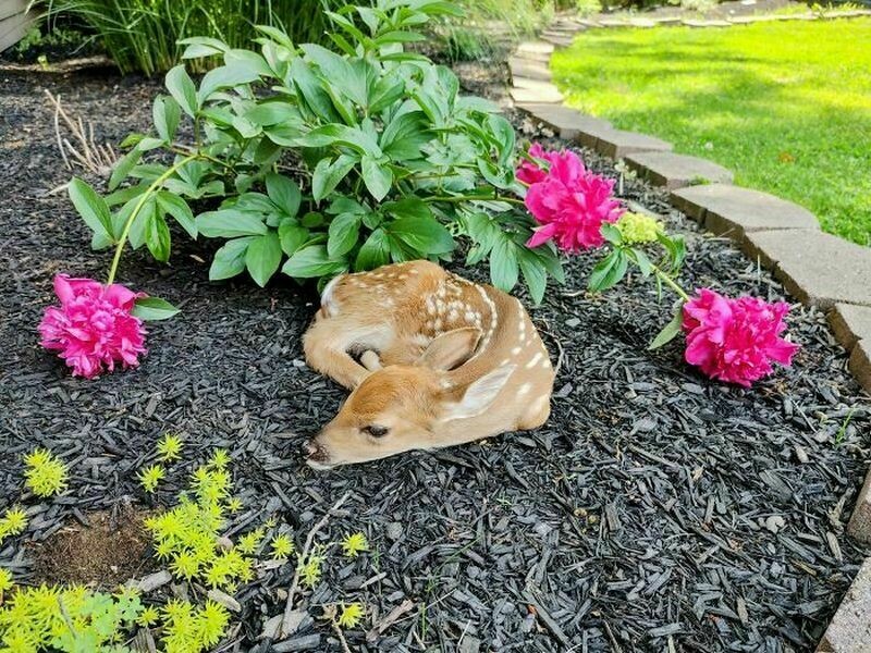 Маленький олененок, которого оставила мама в клумбе с пионами
