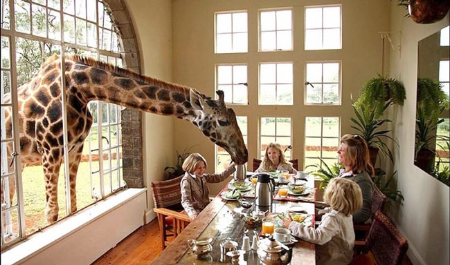 О, да! Жирафы Ротшильда существуют и вы встретите их в Giraffe Manor, в Кении. Они будут знакомиться с вами во время прогулки по 140-акровому заповеднику, игре на лужайке перед домом, или заглядывая в окно во время вашего семейного завтрака.