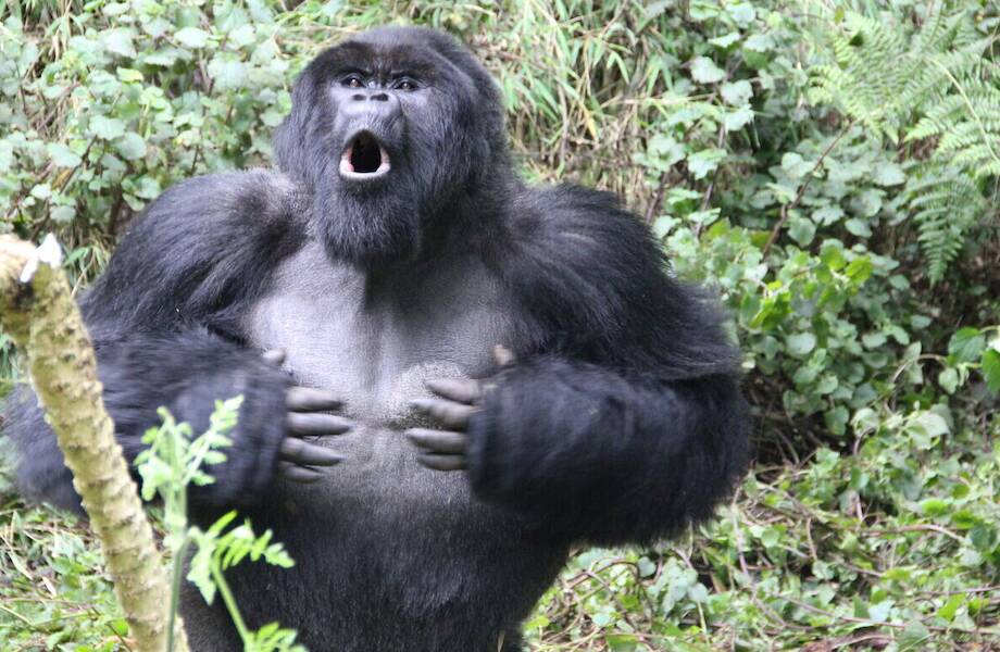 Гориллы на первый взгляд кажутся весьма опасными животными. Взрослый примат весит около 150 кг, у него очень мощное тело и развитая мускулатура. Особенно устрашающе выглядит, когда горилла начинает бить себя в грудь, кажется, она готова кинуться на противника. Кстати, мы рассказывали, почему гориллы ударяют себя по груди и что они хотят сказать этим движением.