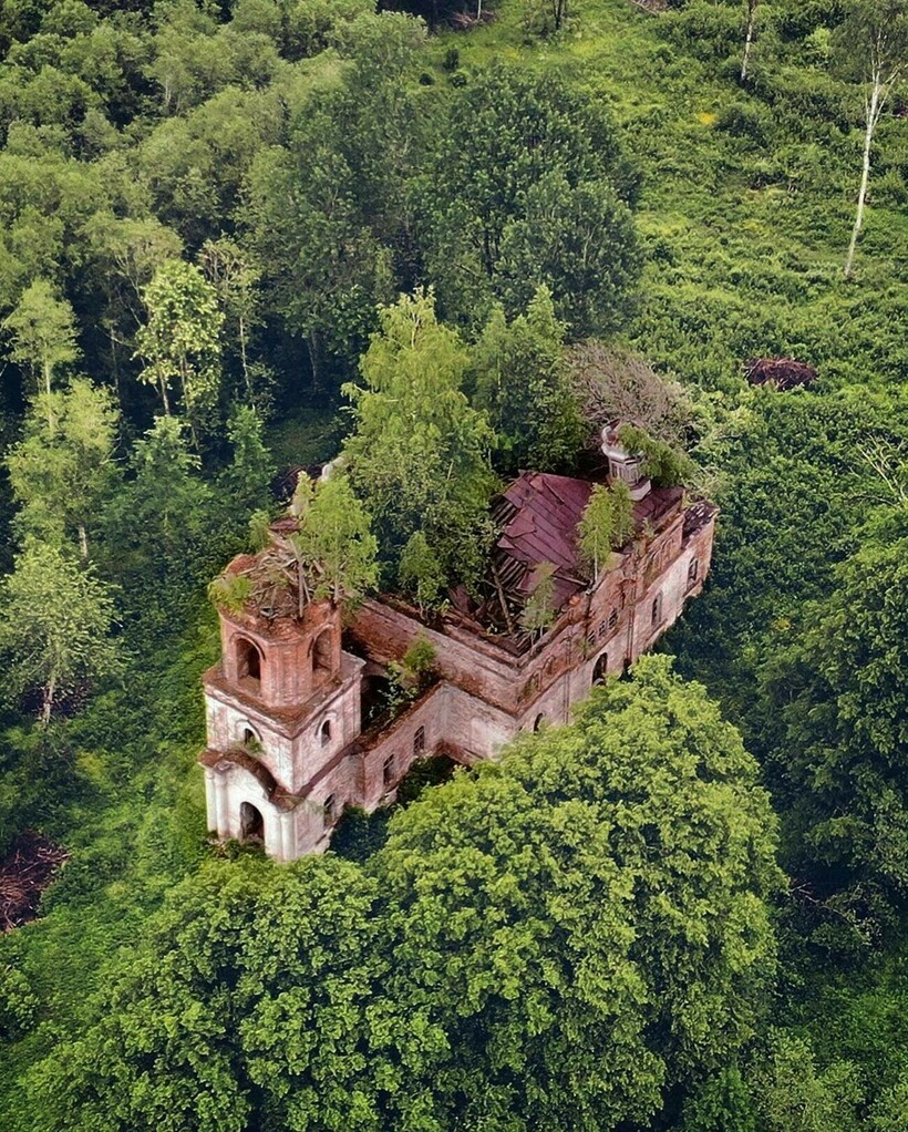 Церковь с лесом на крыше в деревне Турны, Тверская область