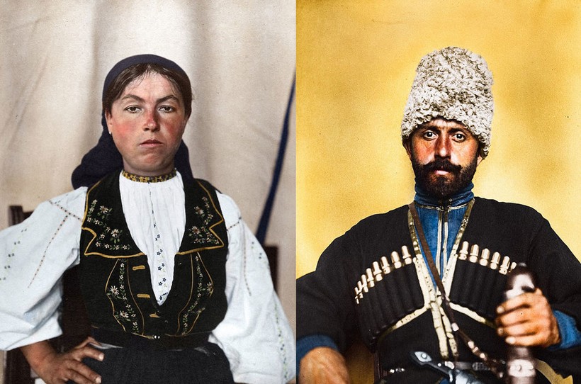 На фото слева: Румынка. Примерно 1905–1914 годы. На фото справа: Казак из России. Примерно 1905–1914 годы