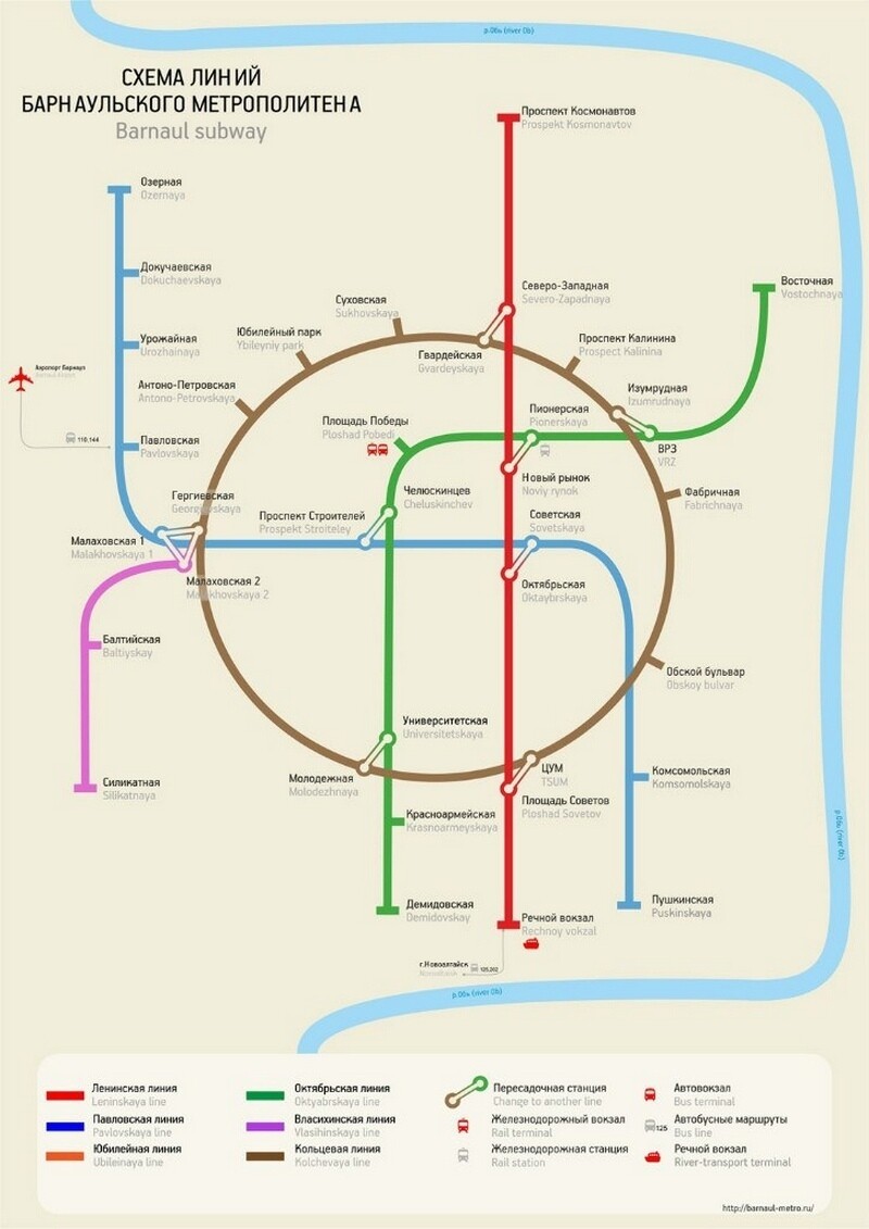 Подземка Барнаула открылась в 1974 году. Как говорят местные жители, вы ее не увидите, потому что она находится под землей. У метрополитена 37 станций и 5 линий: такое же количество линий у метро Санкт-Петербурга. Согласитесь, для городка с населением менее 700 тысяч человек такой общественный транспорт — большое инженерное сооружение.