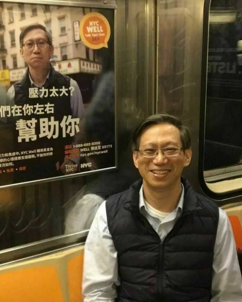 Мужчина в футболке со схемой метро сидит под схемой метро