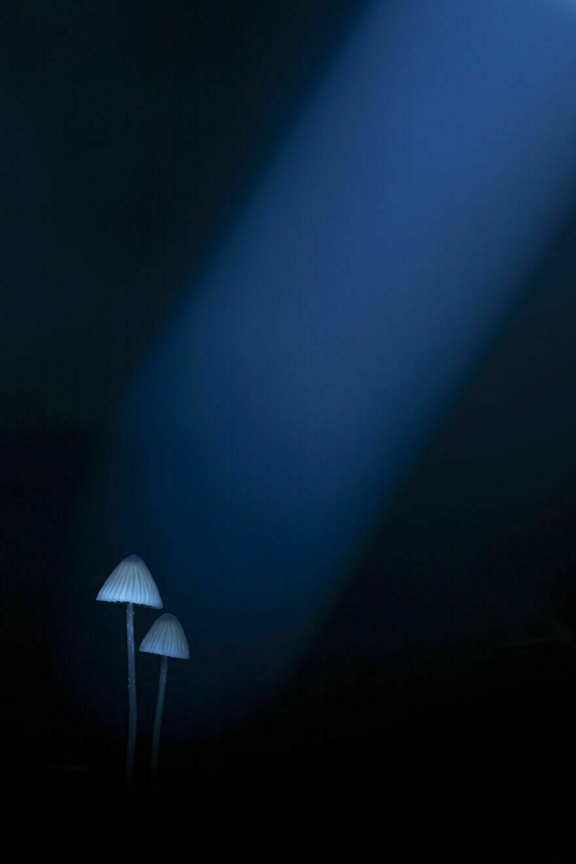 Два грибочка рода Мицена в луче солнца