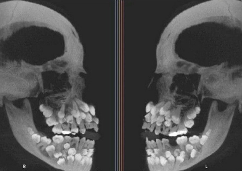 Рентген человека, больного полиодонтией, при которой вырастает аномально большое количество зубов