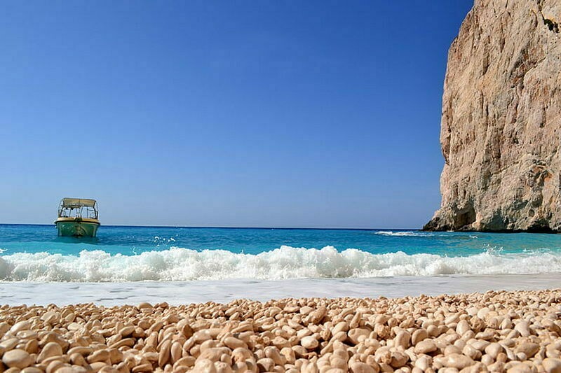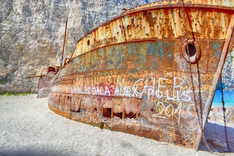 Остров Закинф известен своим белоснежным песком и лазурным морем. Но самое популярное место тут — скрытый пляж Навайо. Правда, скрытым его назвать можно только из-за сложной доступности: по берегу сюда добраться невозможно. Приезжают к пляжу на кораблях, яхтах и лодках, и туристов здесь довольно много.