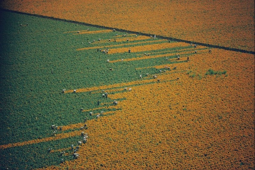 Поле календулы превращается из оранжевого в зеленое, Мексика