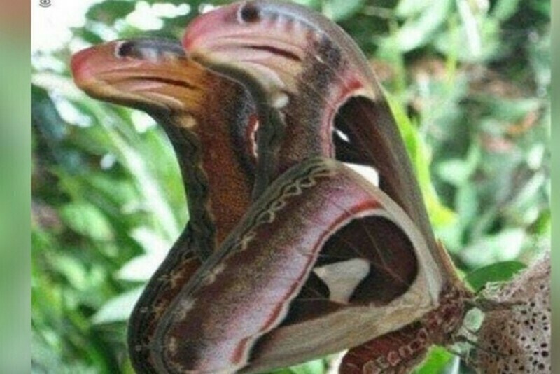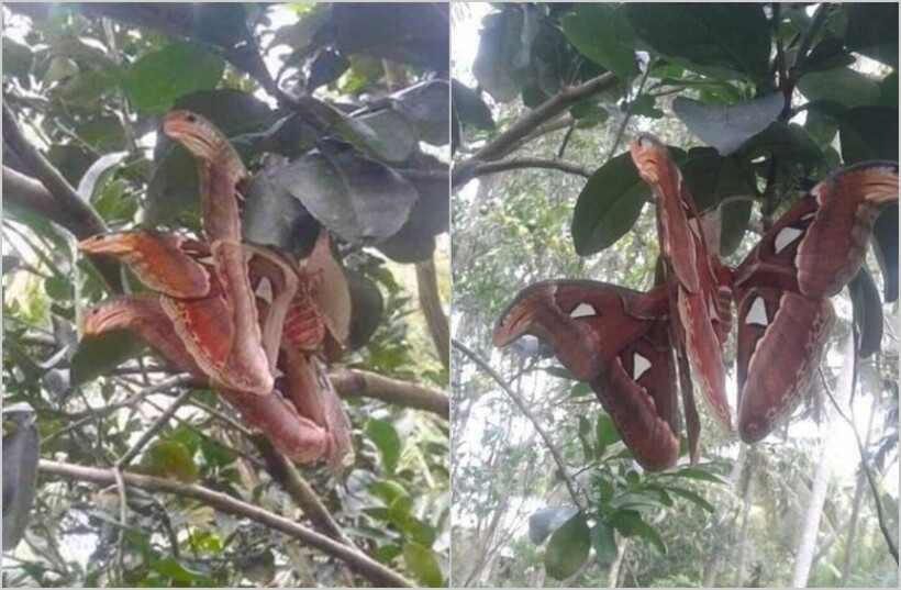 Существо на снимке действительно легко принять за разъяренных змей, которые готовы к атаке. Но на самом деле это чудеса маскировки павлиноглазки атлас (или Attacus Atlas). Эта бабочка научилась притворяться змеей. Кстати, о других чудесных способах маскировки в животном мире мы рассказывали в этом материале.