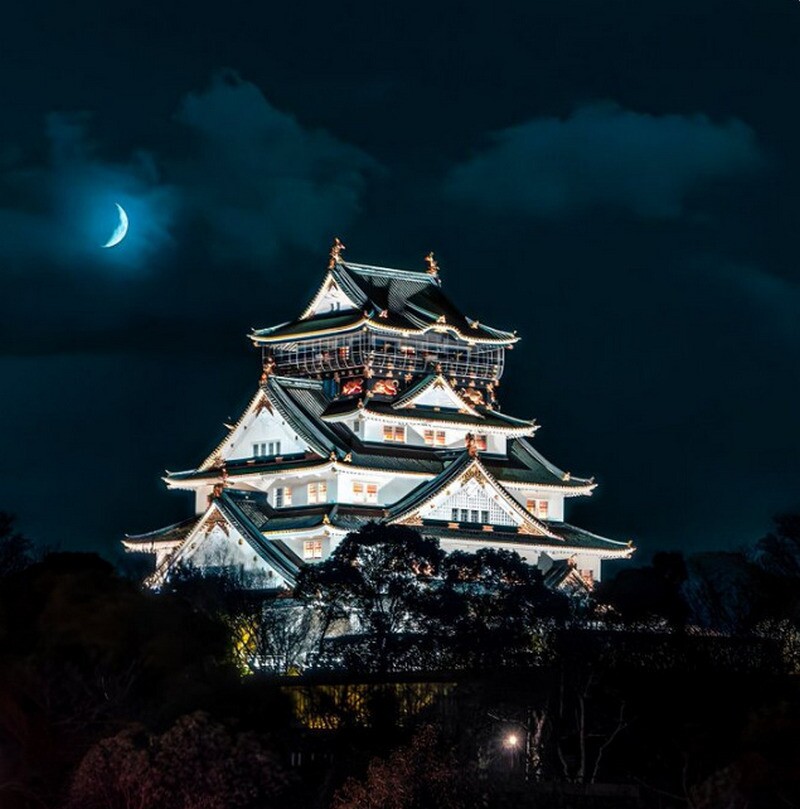 Самурайский замок в Осаке ночью