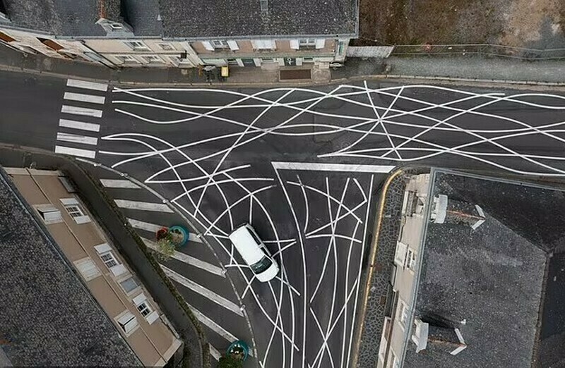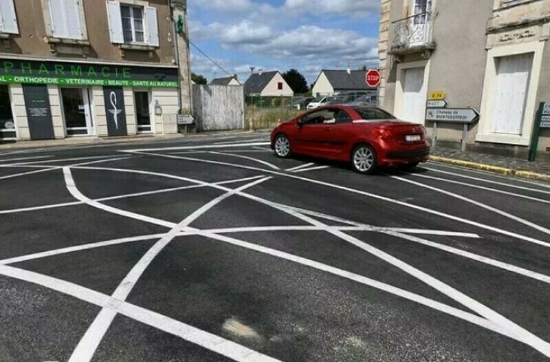 Хаотичные линии появились в городе Боне (Bauné) в департаменте Мен и Лаура. Боне — маленький французский городок, в котором проживает 1700 человек. У него есть одна особенность: он стоит на важной транспортной артерии Франции, на пересечении двух крупных дорог. Ежедневно мимо Боне проезжают больше двух тысяч автомобилей, которые практически никогда не соблюдают скоростной режим. При въезде в город стоит ограничение скорости в 30 км/час, однако лишь редкие водители начинают ехать медленнее. Поэтому власти решили перехитрить водителей и сделали на дороге запутанную разметку. Самое удивительное, что их план сработал!