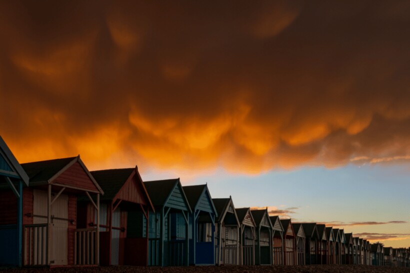 Вымеобразные облака над пляжными домиками английского городка Херн-Бей