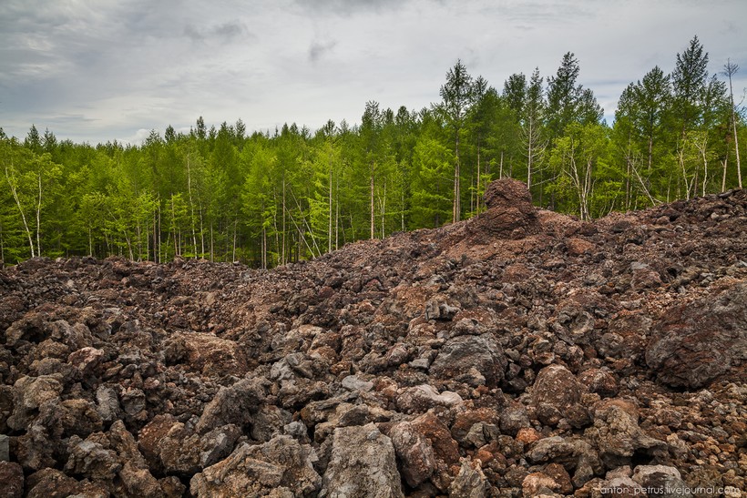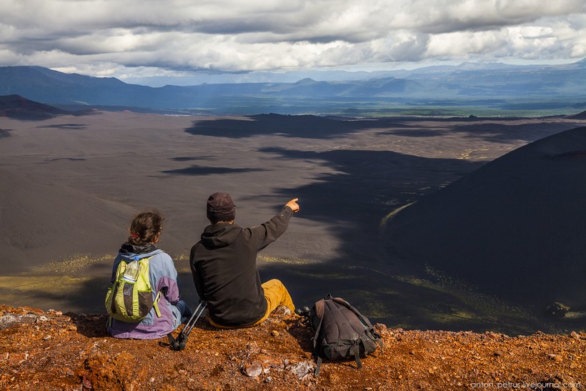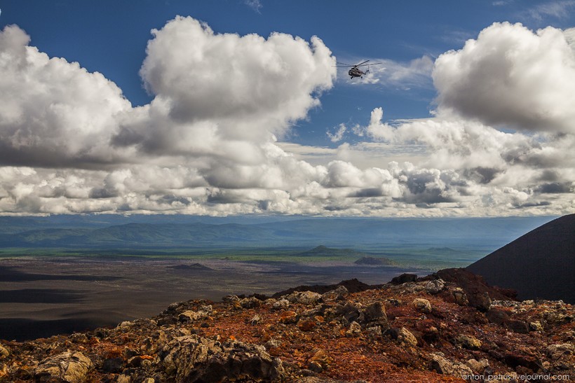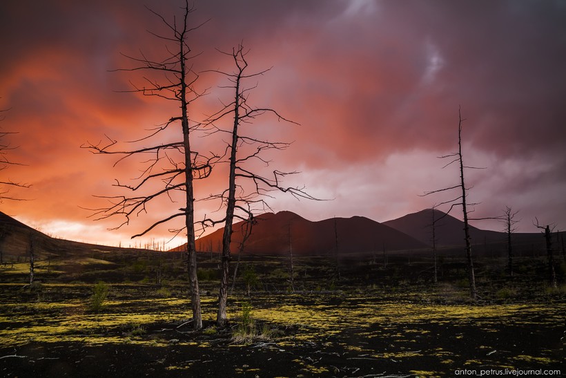 Наше путешествие началось с изучения окрестностей вулкана Толбачик. А там есть что посмотреть: свежие лавовые поля, уникальный мертвый лес с изумрудным мхом, куча лавовых конусов. И все это выглядит совершено космически.