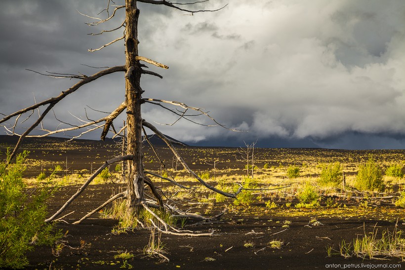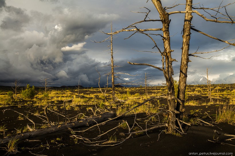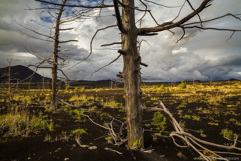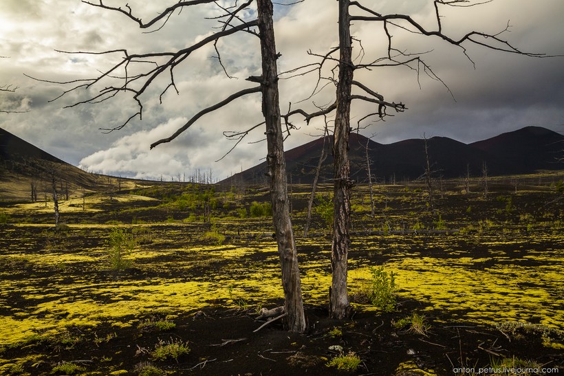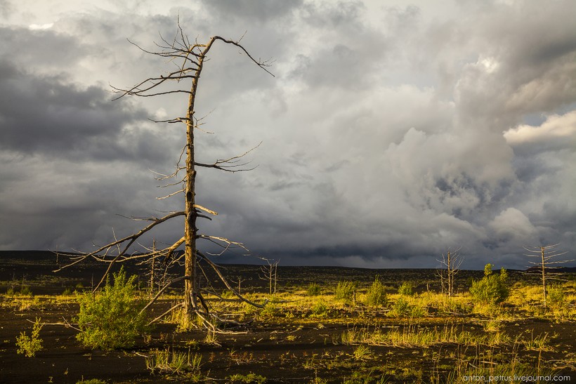 Погода была очень суровой — на небе клубились дождевые облака ,закрывая склон Толбачика. Собственно, он должен быть виден прямо за этим деревом. Интересный свет играл среди скелетов деревьев.