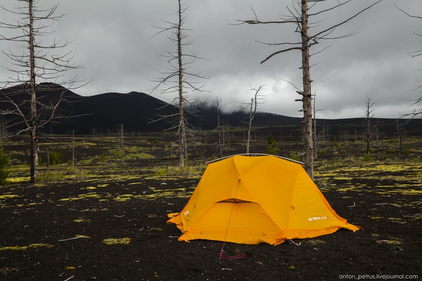 Лагерь разбили на стоянке «Вертолет», где в 1975 году совершил аварийную посадку Ми-4, хвост которого до сих пор торчит из вулканического грунта.