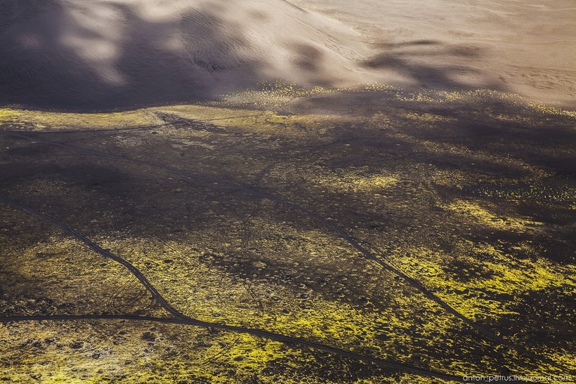 Между конусами видны накатанные за годы дороги, по которым туристов возят большие камазы.