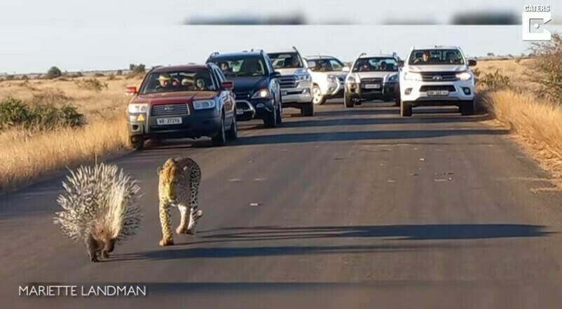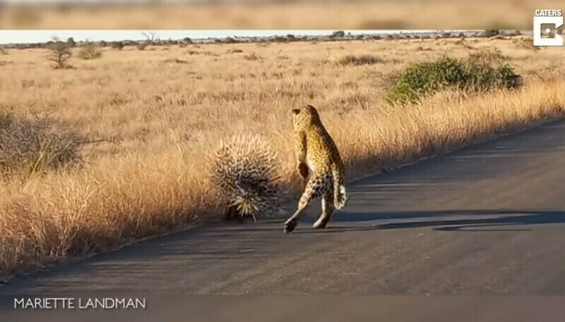 За подобной охотой удалось понаблюдать туристам, путешествующим по ЮАР. Прямо на трассе они встретили дикобраза, к которому подкрался леопард. Полтора часа продолжалась напряженная схватка. Леопард делал перерыв, вытаскивая из лап иголки. В итоге хищнику пришлось признать поражение и уйти зализывать раны.