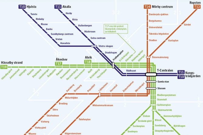 Открыли метро в 1950 году. Здесь три линии общей протяженностью около 106 километров. На них расположены 100 станций, 48 из которых подземные, а 52 ― надземные или наземные. Примечательно, что движение на этих линиях левостороннее, так как на момент открытия метро в Швеции было левостороннее движение.