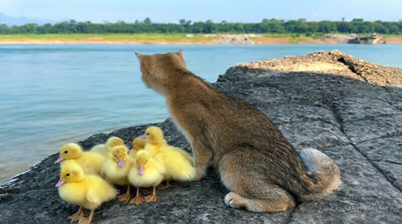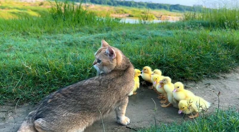 У Кикиг есть удивительные друзья — утята и цыплята. Птенцы часто делят с кошкой лежанку. Более того, даже мама-утка приводит к Кикиг детенышей в мягкую кошачью кроватку. Кажется, пернатая мать полностью доверяет кошке и даже отправляет птенцов на прогулку вместе с ней. Так, на видео запечатлен момент, когда Кикиг ведет утят к водоему для купания. Малыши, кстати, предпочли не заходить в воду, а остались на берегу рядом со своей мурлыкающей нянечкой.