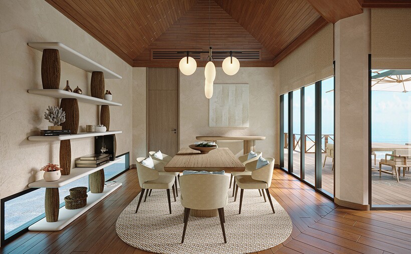 Проект реновации разработан архитектурным бюро BLINK из Сингапура, специализирующимся на гостиничном дизайне и создавшим одни из лучших отелей в Азии и на Ближнем Востоке. Вдохновившись природной красотой острова Huvafen Fushi, что с мальдивского языка дивехи переводится как «остров мечты», бюро создало интерьеры в теплых тонах с преобладанием чистых линий, природных материалов и орнаментов, повторяющих рябь морской глади, узоры белоснежных пляжей, нарисованные ветром, и архитектурность тропических растений.