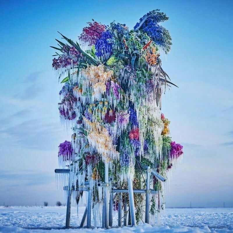 Это настоящие цветы, которые художник полил водой, чтобы превратить в ледяную скульптуру.