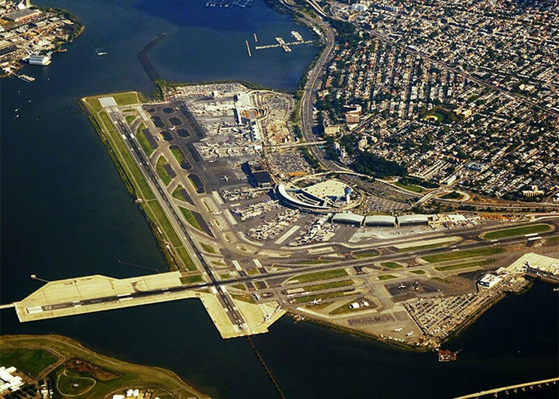 Небольшой нью-йоркский аэропорт Ла-Гуардия на побережье, в котором ВПП перекрещены