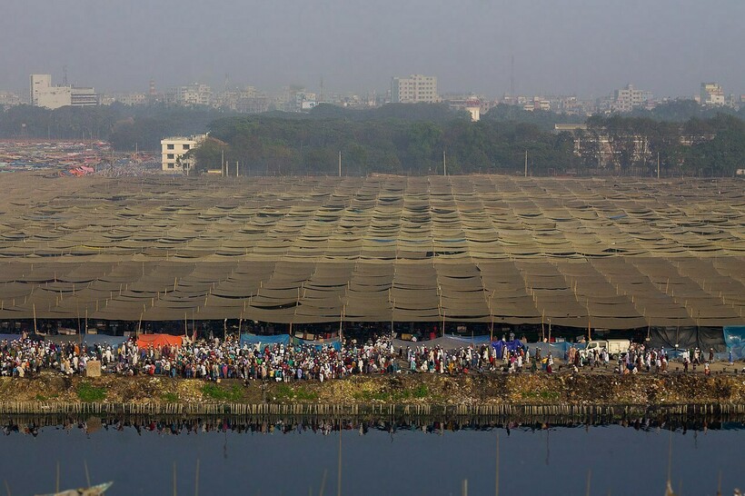 Бишва иджтима — одно из важнейших событий в жизни мусульман Бангладеш. Проводят его на берегу реки Тураг на окраине Дакки. Этот город и так считается одним из самых густонаселенных на планете (вот тут мы рассказывали об этом подробнее), но во время бишвы иджтимы здесь творится настоящее безумие. Три дня люди живут в палатках под открытым небом, едят скромную пищу, молятся и слушают мусульманских ученых, которые трактуют Коран.