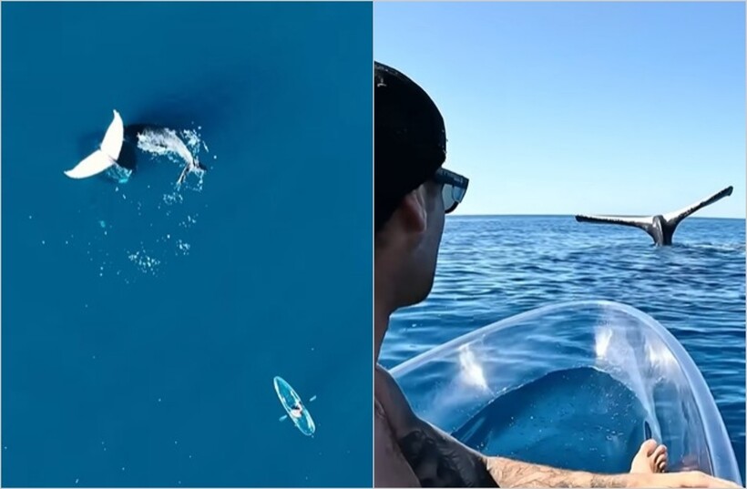 Мосс плавает на прозрачном каяке, благодаря чему все, что происходит в воде, ему прекрасно видно. Мужчин подплыл киту настолько близко, что очертания животного стали видны под водой через прозрачную лодку. Но самое удивительное то, в какой позе был кит: его хвост был направлен в небо, и в таком положении он держался некоторое время.