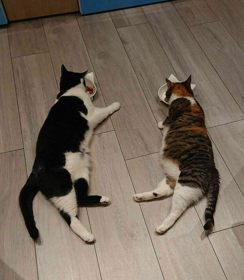 Новая кошка научила старую кошку есть лежа