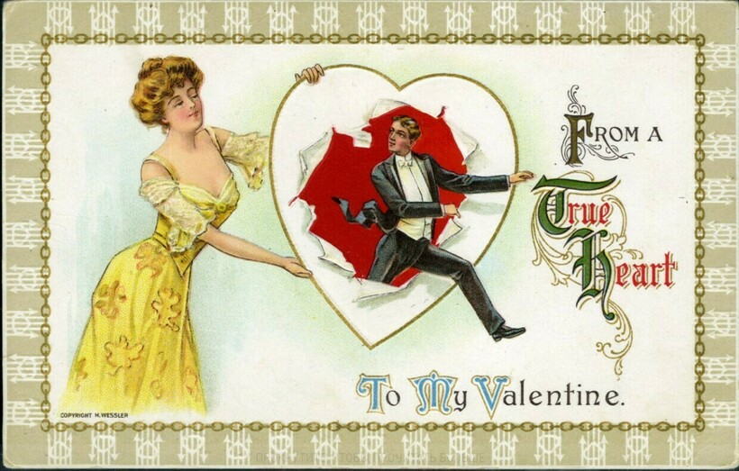 Как и многие другие праздники, День святого Валентина уходит корнями в фестивали Древнего Рима. Правда, в них не было большой романтики: мы рассказывали, как римские вакханалии превратились в день для влюбленных. В России праздник стал популярным в 1990-х годах, когда на наши экраны хлынули зарубежные фильмы, в которых периодически упоминался День святого Валентина. Тогда же закрепилась и традиция ― дарить милые открытки в виде сердечек. Однако валентинкам на самом деле много столетий. Мы отыскали старинные открытки, которыми возлюбленные поздравляли друг друга в этот праздник в разные времена.
