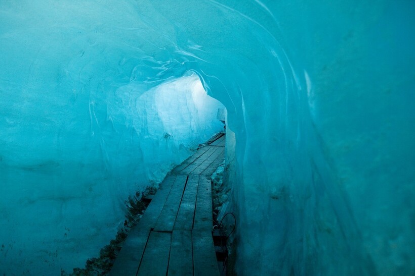 Однако грот в Ронском леднике все еще вырубается каждое лето. И он удивителен по своей красоте. Для создания пещеры выбирают место с кристально чистым льдом неземных синих оттенков. Льду в пещере от 200 до 300 лет, и он напоминает слоистый торт. В срезе отлично видно, как годами формировался лед: в теплое время года на слое снега оседала пыль, а зимой сверху на нее ложился свежий снег, который превращался в лед.