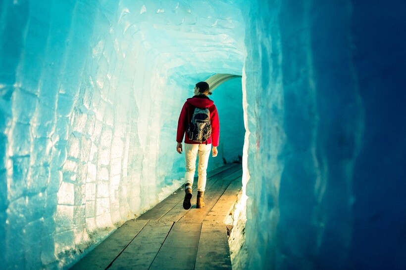 Однако ледник и горы — не единственная достопримечательность, которая была в шаговой доступности от Belvédère. Здесь был естественный грот длиной несколько сотен метров, в который можно было зайти. На нашей планете не так много мест, где можно изучить ледник изнутри, и Belvédère был одним из таких мест.