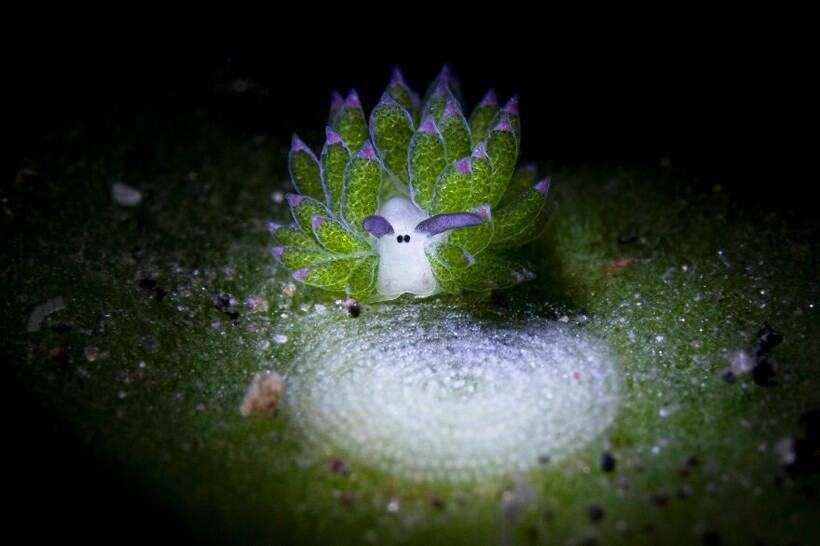 Очаровательный моллюск Costasiella kuroshimae рядом со своими идеальными яйцами