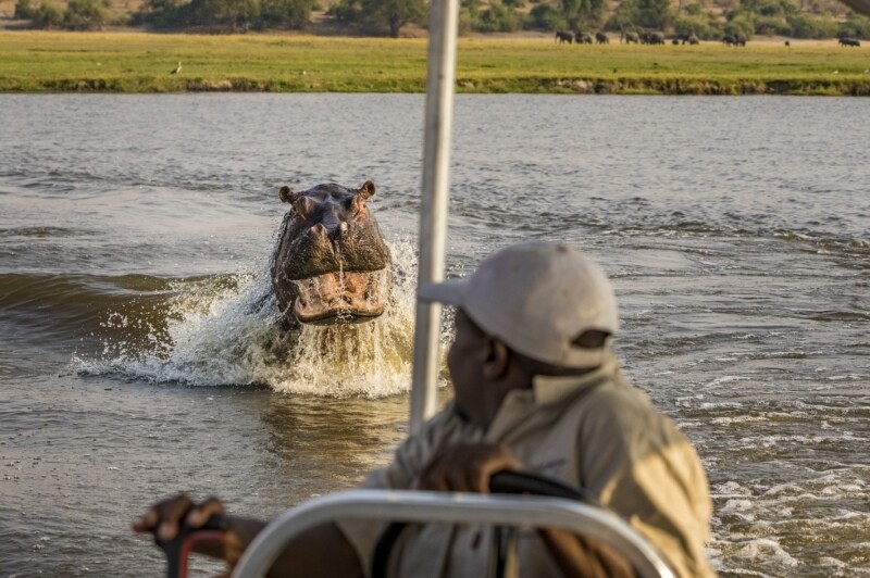 Третье место: гид с туристами пытается уплыть от разъяренного бегемота на реке Ботсваны