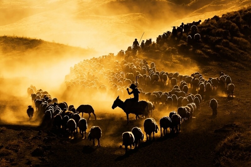 Пастух гонит стадо овец на гору Немрут к лучшим пастбищам, Турция