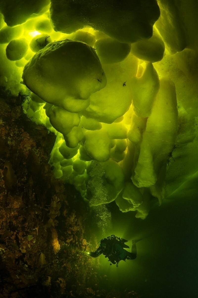 Аквалангист плавает под ледяным щитом Белого моря, который похож на величественную скульптуру