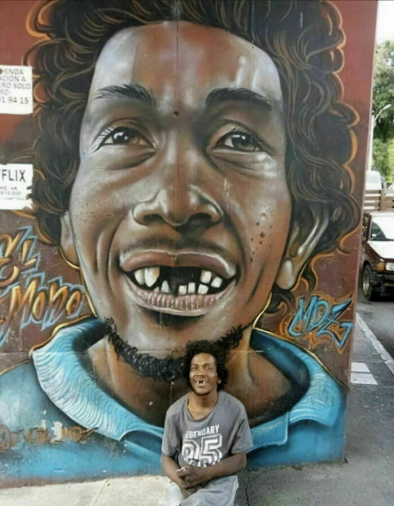 Художник нарисовал бездомного возле стены, где он постоянно сидит