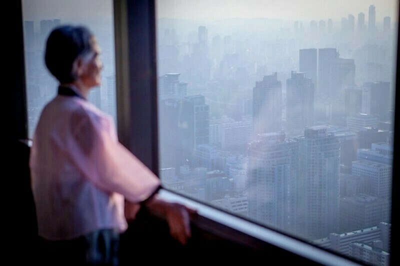 Женщина в традиционном наряде наблюдает за горизонтом южнокорейской столицы из небоскреба.