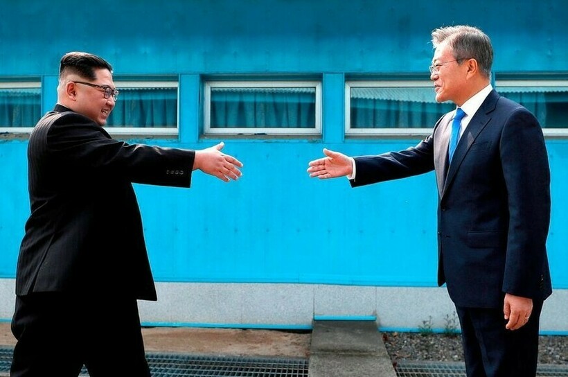 Этот снимок можно назвать знаковым, так как Ким Чен Ын стал первым северокорейским лидером, который посетил Южную Корею с визитом. Он за руку здоровается с южнокорейским президентом Мун Чжэ Ином. Эта встреча 2018 года стала важной вехой в истории двух стран: во время нее начались мирные переговоры.